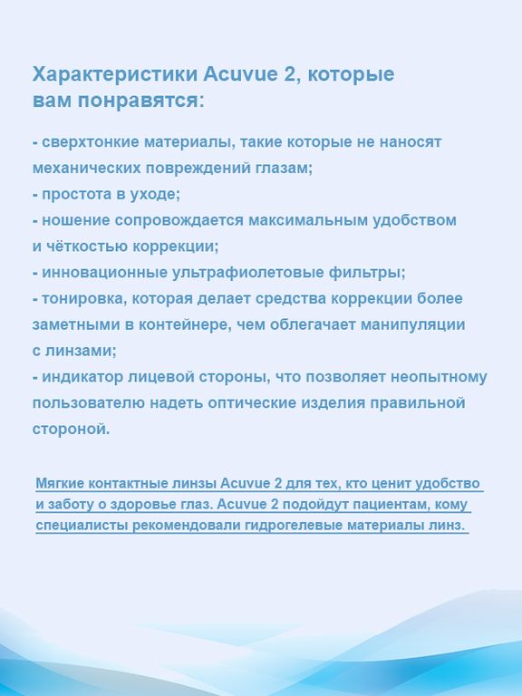 Если Вам нужны удобные и комфортные контактные линзы с оптимальным сочетанием цены и качества, тогда ACUVUE 2 станут для Вас лучшим вариантом выбора.