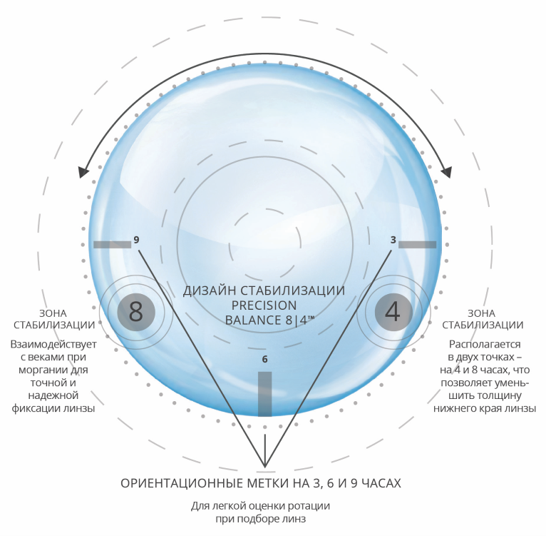 Четкое зрение: дизайн Precision balance стабилизирует положение линзы на глазу, чтобы предотвратить «размывание» изображения. Технология учитывает естественный механизм моргания для сохранения стабильности линзы на глазу, что обеспечивает непревзойденную остроту зрения.
