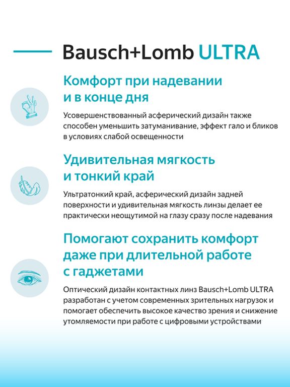 Оптический дизайн контактных линз Bausch+Lomb ULTRA разработан с учетом современных зрительных нагрузок и помогает обеспечить высокое качество зрения и снижение утомляемости при работе с цифровыми устройствами.