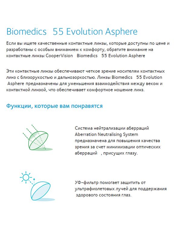 Biomedics 55 Evolution - контактные линзы, обладающие превосходными характеристиками, проверенными временем. При их производстве использована технология создания круглого края и специального оптического дизайна передней поверхности. Это позволит вам наслаждаться комфортом ношения линз и четкостью вашего зрения.