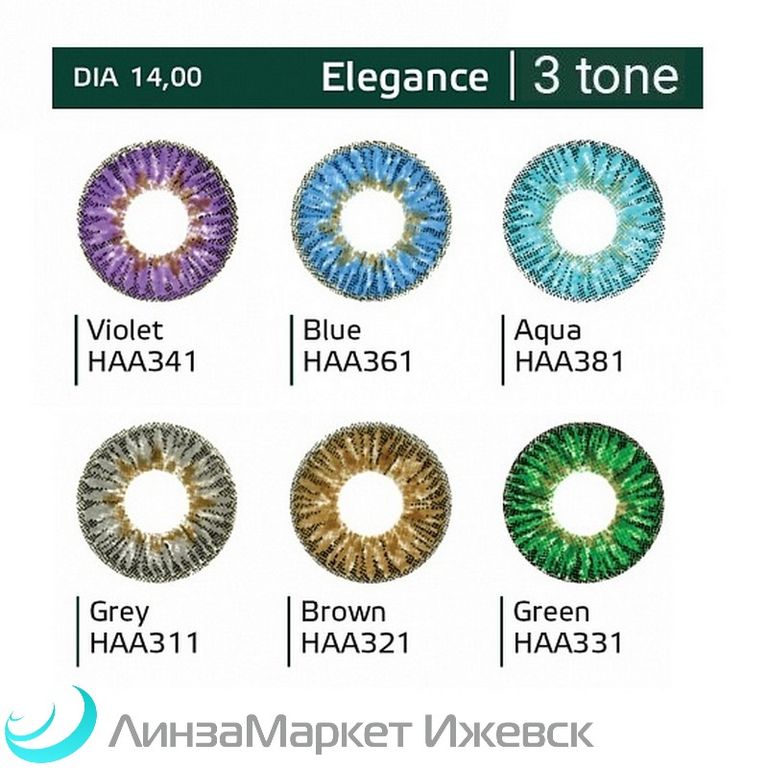 Серия Elegance – представлена в шести цветах: Violet, Blue, Aqua, Gray, Brown, Greeт. Hera Elegance - 3-тоновые яркие, насыщенные, плотные по цвету линзы. Подойдут для кардинальной смены цвета светлых и темных глаз.