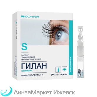 Раствор увлажняющий офтальмологический Гилан Комфорт. Одна тюбик-капельница (юнидоза): натрия гиалуронат 0,18 % (1,8 ± 0,36 мг/мл), сорбитол (18,00 - 22,00 мг/мл), динатрия гидрофосфат дигидрат (7,48 - 9,14 мг/мл), натрия дигидрофосфат дигидрат (2,83 - 3,45 мг/мл), вода для инъекций (до 0,4 мл).