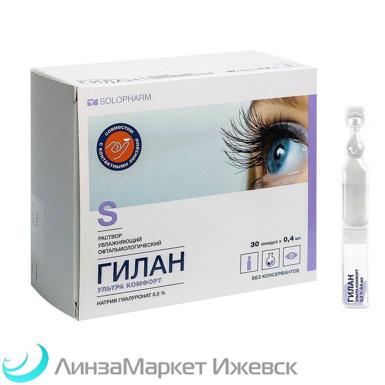 Раствор увлажняющий офтальмологический Гилан Ультра комфорт. Одна тюбик-капельница (юнидоза) содержит: натрия гиалуронат 0,3 % (3,0 ± 0,60 мг/мл), сорбитол (18,00 - 22,00 мг/мл), динатрия гидрофосфат дигидрат (7,48 - 9,14 мг/мл), натрия дигидрофосфат дигидрат (2,83 - 3,45 мг/мл), вода для инъекций (до 0,4 мл).