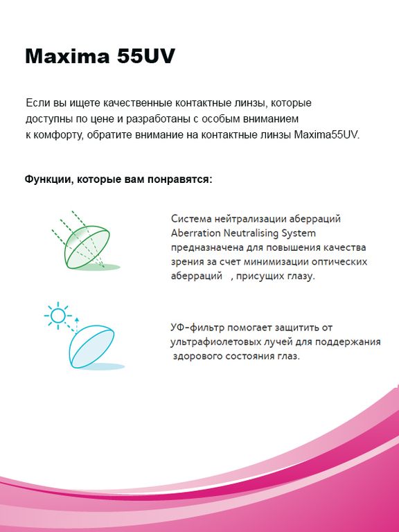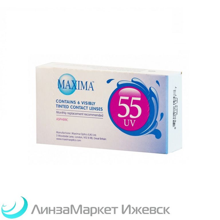 Maxima 55 (Максима 55) - превосходные линзы в своей категории, завоевавшие популярность во всем мире. MAXIMA 55UV - это линзы ежемесячной замены, обеспечивающие отличное зрение и удобство ношения одновременно с защитой от ультрафиолетового излучения.