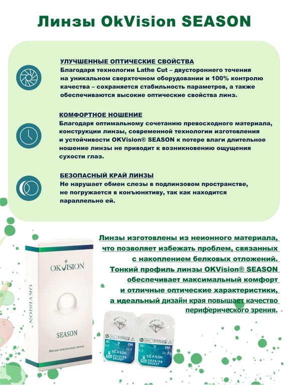 Линзы OkVision Season изготовлены из неионного материала, что позволяет избежать проблем, связанных с накоплением белковых отложений. Тонкий профиль линзы OKVision Season обеспечивает максимальный комфорт и отличные оптические характеристики, а идеальный закругленный дизайн края повышает качество периферического зрения.