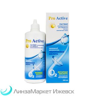 Многофункциональный раствор «Pro Active», помимо традиционных очищающих и дезинфицирующих веществ, содержит эффективные и безопасные природные компоненты - гиалуроновую и янтарную кислоты. Данные вещества в совокупном действии способны оказать цитопротекторное, антиоксидантное и метаболическое действия на ткани глаза при использовании контактных линз. Раствор «Pro Active» помогает предотвратить нежелательные гипоксические осложнения при ношении контактных линз, облегчает период адаптации, а также повышает общий комфорт ношения контактных линз в течение дня и всего периода их использования.
