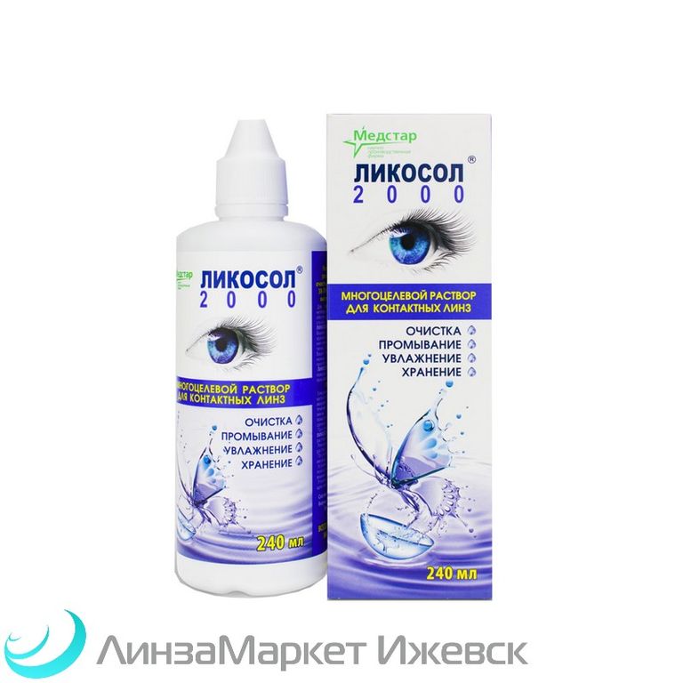 Мультифункциональный раствор для хранения, промывания и очистки всех видов мягких и жёстких газопроницаемых (гибких) контактных линз Ликосол-2000.