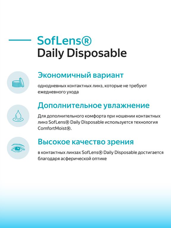 SofLens Daily Disposable - это экономичный вариант однодневных линз, которые не требуют ежедневного ухода и помогают обеспечить высокое качество зрения благодаря асферической оптике.