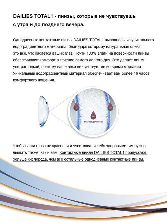 Alcon Dailies Total 1 — это первые в мире и пока единственные водоградиентные контактные однодневные линзы. При создании данных линз был использован уникальный водоградиентный материал делефилкон А, отличающийся беспрецедентным влагосодержанием и очень высокой проницаемостью кислорода. Влагосодержание 33% внутри линзы, постепенно возрастает до 80%, а у поверхности достигает почти 100%. При их производстве была применена уникальная технология LightStream, за счет которой линзы успешно совмещают в себе прекрасную гидрофильность и высокое пропускание кислорода. Благодаря высокому содержанию влаги изделия являются ультрагладкими настолько, что во время моргания они не ощущаются веком и могут использоваться на протяжении 16 часов.